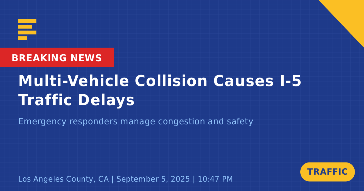 A traffic collision involving four vehicles occurred today on Interstate 5 (I-5) in Los Angeles County, CA, leading to significant traffic delays. The incident took place around 10:49 PM and involved a newer model white Honda Civic, a newer model green Toyota, and two additional vehicles.