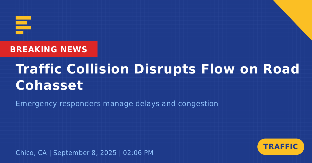 A traffic collision occurred today at approximately 2:06 PM on 5800 Cohasset Road in Chico, CA, involving two vehicles: a grey Jeep and a blue Toyota. Emergency response units quickly arrived at the scene to manage the situation and ensure roadway safety.