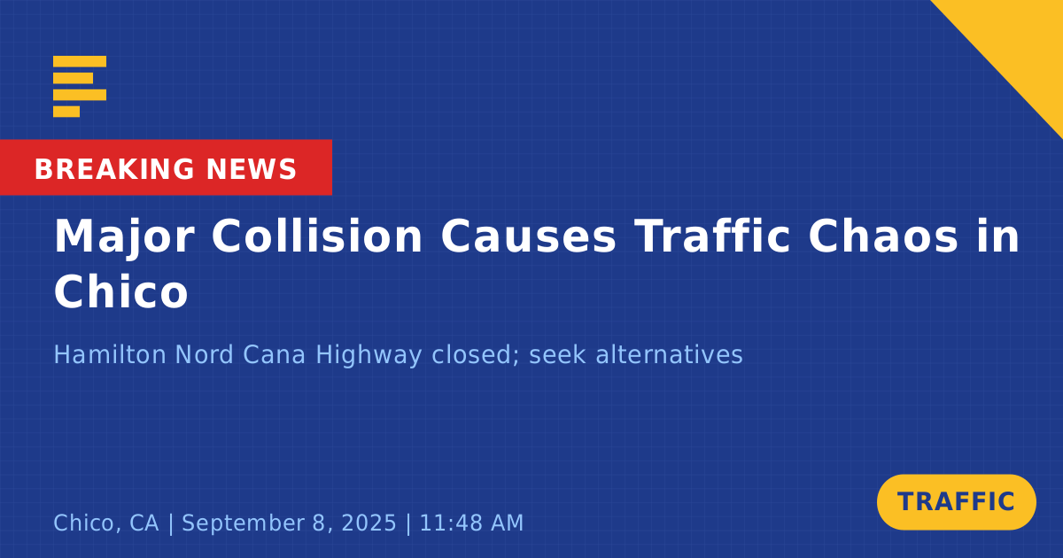 A significant traffic collision occurred today on Hamilton Nord Cana Highway at Wilson Landing Road in Chico, CA, involving two vehicles: a semi-truck and a silver Honda CRV. The incident took place around midday, leading to a complete closure of the roadway and causing major traffic disruptions.