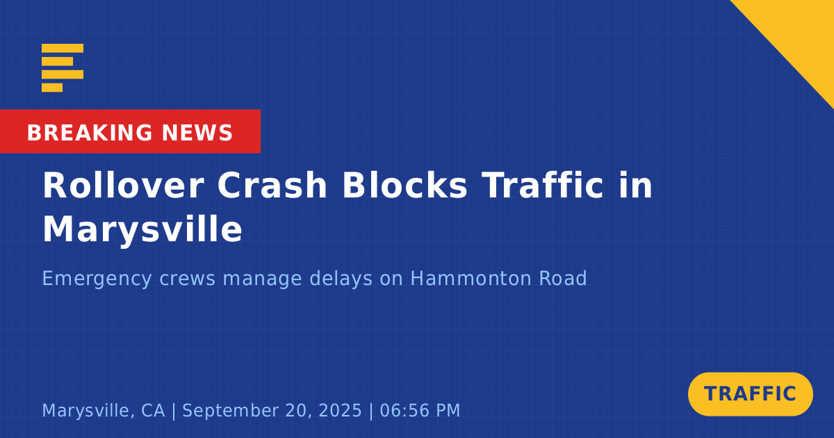 A traffic collision occurred today on Hammonton Smartville Road in Marysville, CA, involving a single vehicle. The incident took place around 6:57 PM when an Acura rolled over and landed in a ditch, blocking the roadway. This obstruction led to significant traffic delays as emergency services responded to the scene.