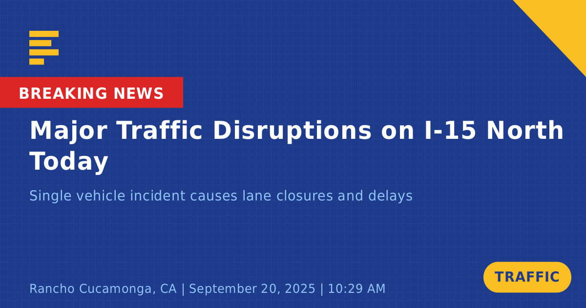 A traffic collision on Interstate 15 North in Rancho Cucamonga, CA, caused significant traffic disruptions today. The incident involved one vehicle, a white four-door Kia sedan, which became non-drivable and was blocking a slow lane. The collision occurred around 10:29 AM, leading to slow-moving conditions and lane closures in the area.