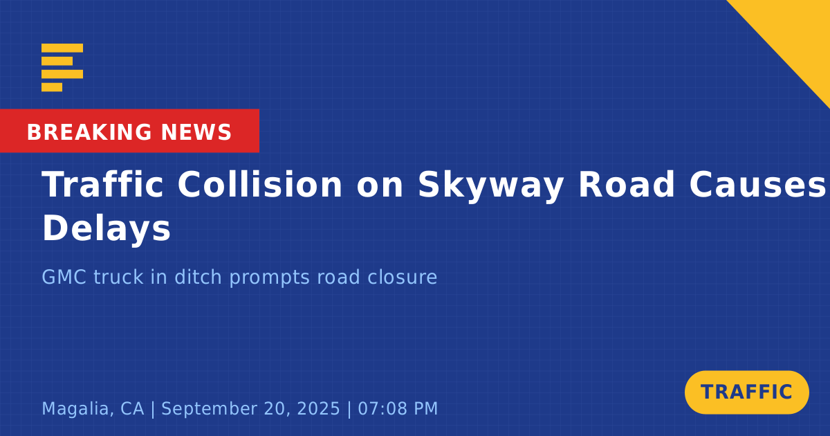 A traffic collision on Skyway Road in Magalia, CA, has caused significant traffic disruptions today. The incident, involving one vehicle, a GMC pickup truck, was reported around 7:08 PM. The truck ended up in a ditch, prompting emergency units to respond promptly to manage the scene.