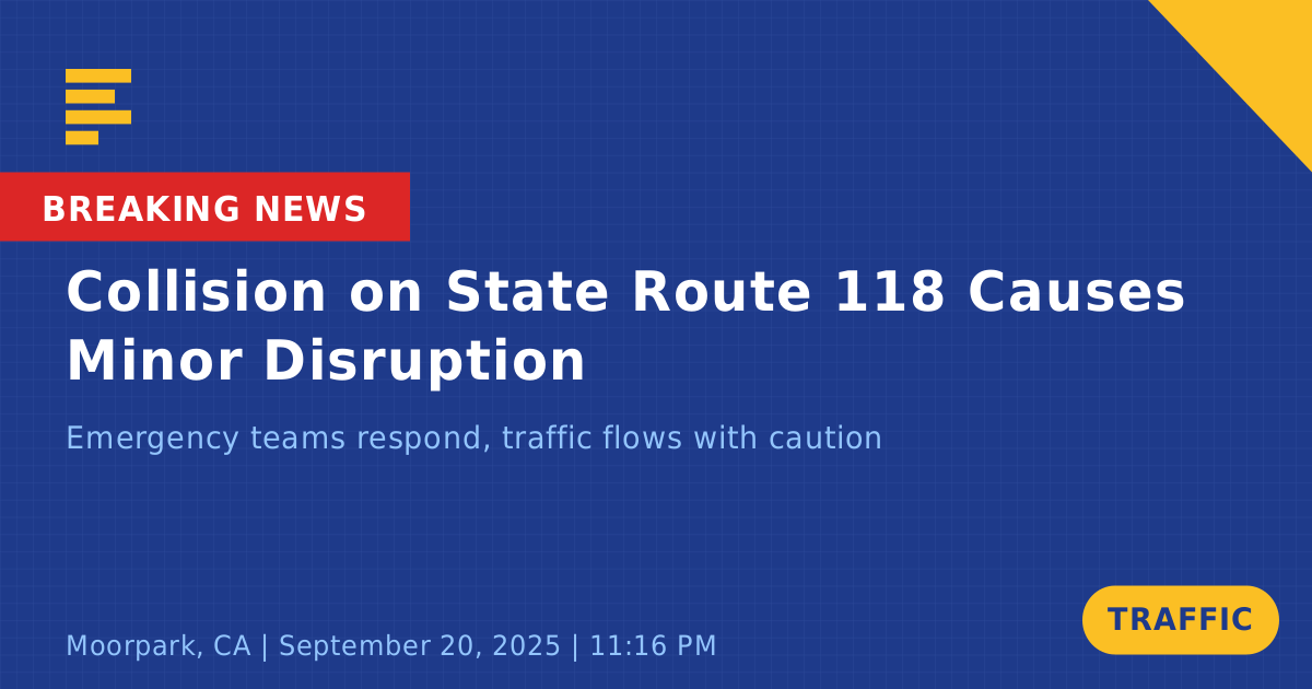 A traffic collision on State Route 118 in Moorpark, CA, occurred today during the late evening hours, involving two vehicles. The incident involved a dark-colored vehicle that collided with a pole, causing one vehicle to be pushed off the roadway. Fortunately, the collision did not block any lanes, allowing traffic to continue flowing with minimal disruption.