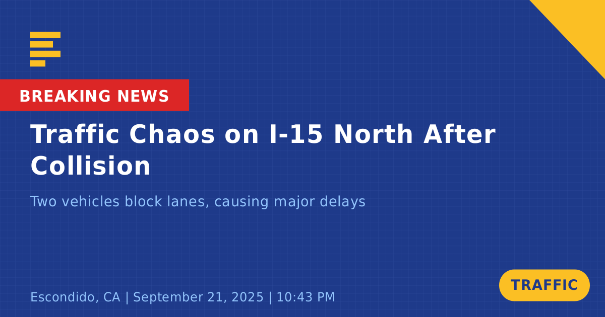 A traffic collision on Interstate 15 North in Escondido, CA, has caused significant disruptions to traffic flow today. The incident involved two vehicles: a white BMW and a red Ford SUV. Following the collision, both the high-occupancy vehicle (HOV) lanes and one to two travel lanes were temporarily blocked, leading to congestion in the area.