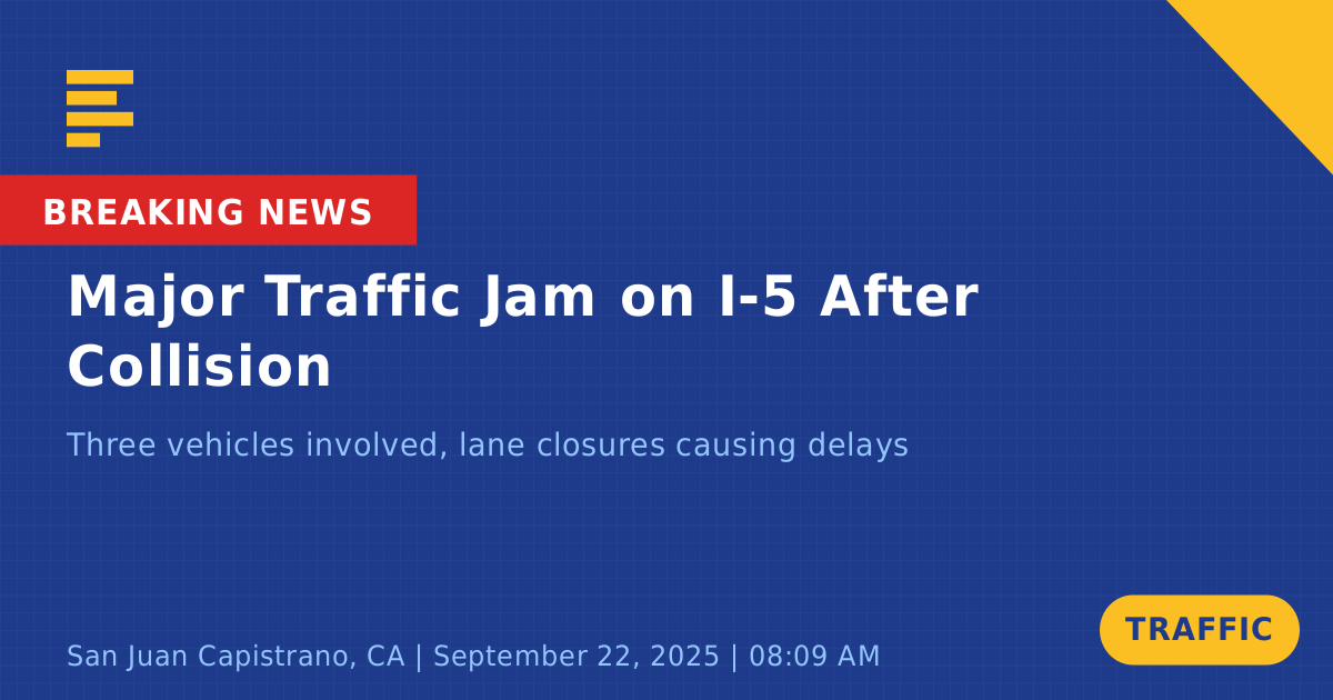 A traffic collision on Interstate 5 South (I-5 S) at State Route 74 in San Juan Capistrano, CA, has caused significant traffic disruptions today. The incident, which occurred during the morning commute, involved three vehicles: a white Ford Bronco, a black sedan, and a black Mercedes C300. The collision resulted in the black Mercedes blocking the middle lanes, leading to lane closures and traffic congestion in the area.