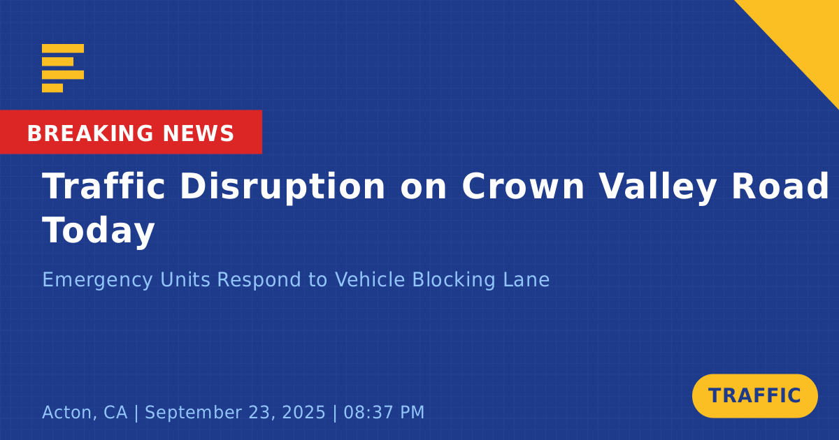 A traffic collision on Crown Valley Road in Acton, CA, has caused significant disruptions to traffic flow today. The incident occurred around 8:39 PM when a solo vehicle left the roadway, blocking the northbound lane. Emergency units arrived promptly to manage the situation and control traffic in the area.