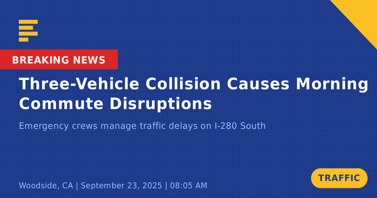 A traffic collision involving three vehicles occurred today on Interstate 280 South near the Woodside Road off-ramp in Woodside, CA. The incident was reported at approximately 8:06 AM, causing significant disruptions during the morning commute.