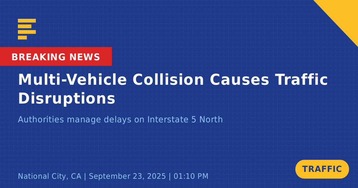 A traffic collision involving three vehicles occurred today on Interstate 5 North near Plaza Boulevard in National City, CA. The incident took place around 1:10 PM and involved a white Hyundai SUV, a Nissan Altima, and a Chevrolet Silverado. The collision resulted in damage to an attenuator, with debris scattered along Plaza Boulevard.