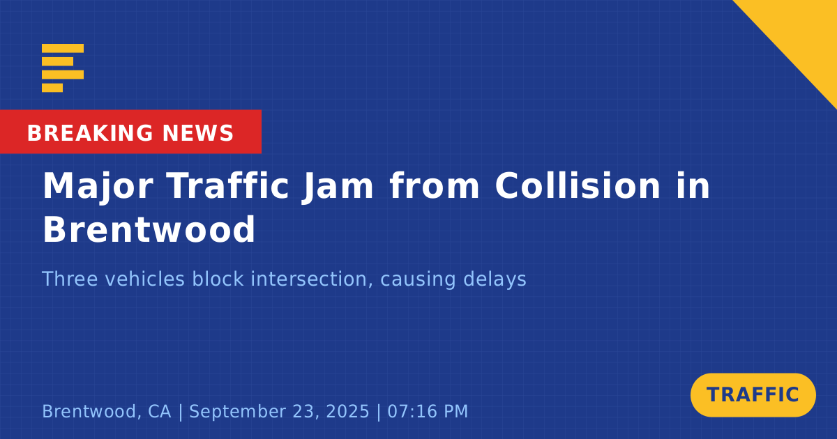 A traffic collision occurred today at the intersection of Marsh Creek Road and Byron Highway in Brentwood, CA, involving three vehicles: a white van, a grey Toyota Prius, and a Ford minivan. The incident was reported around 7:17 PM, resulting in a blockage of the intersection and subsequent lane closures, which have led to traffic delays and congestion in the area.