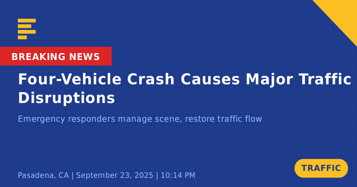 A traffic collision involving four vehicles occurred today on State Route 134 West near North San Rafael Avenue in Pasadena, CA. The incident was reported around 10:16 PM and involved a blue Tesla Model Y, a black Toyota sedan, and a silver Chrysler PT Cruiser. The collision led to significant traffic disruptions, with lane stoppages reported as emergency responders arrived at the scene.