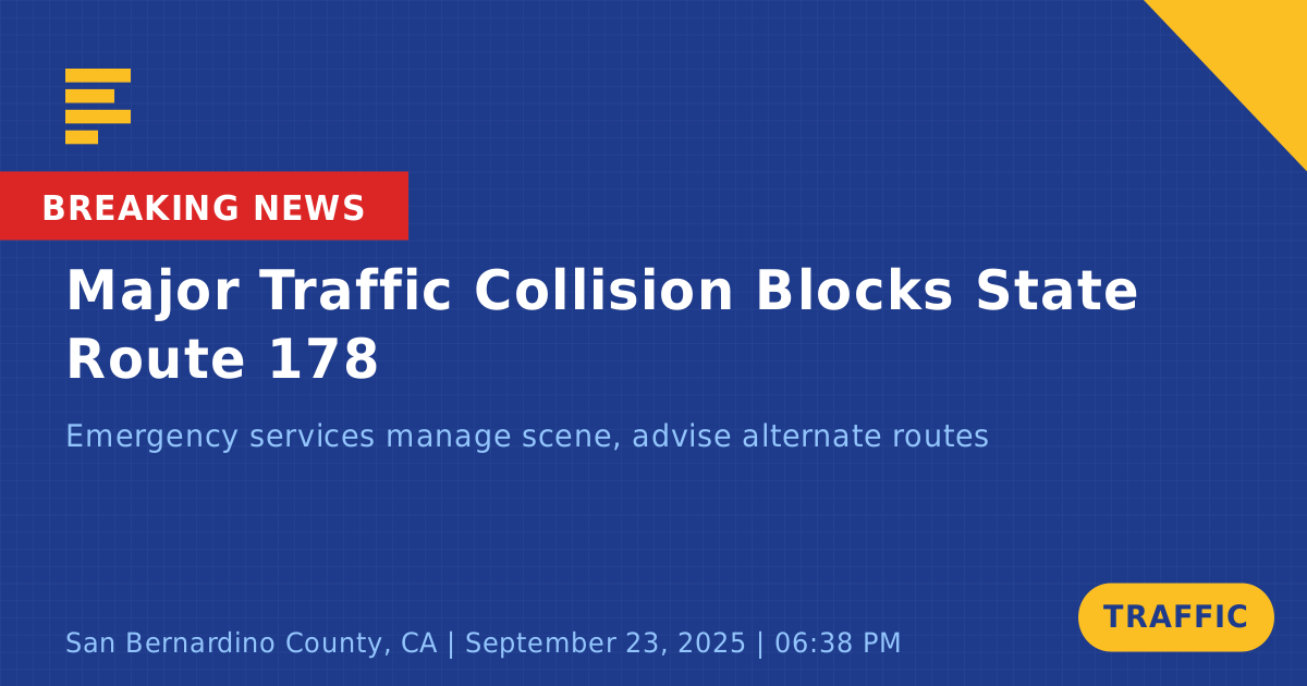 A significant traffic collision occurred today on State Route 178 at Westend Plant in San Bernardino County, CA, resulting in the complete blockage of the westbound lanes. The incident involved four vehicles, including at least one GMC Sierra 4-door. Emergency services responded quickly to manage the scene and direct traffic, as the collision caused substantial delays for motorists during the evening commute.