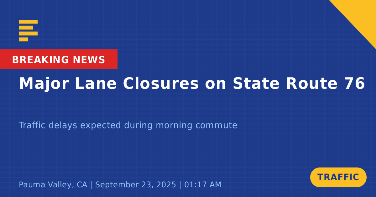 A traffic collision on State Route 76 in Pauma Valley, CA, has led to significant lane closures today. The incident occurred early this morning, resulting in both eastbound and westbound lanes being shut down near Pauma Valley Drive. Emergency services promptly responded to the scene to manage traffic flow and ensure safety.