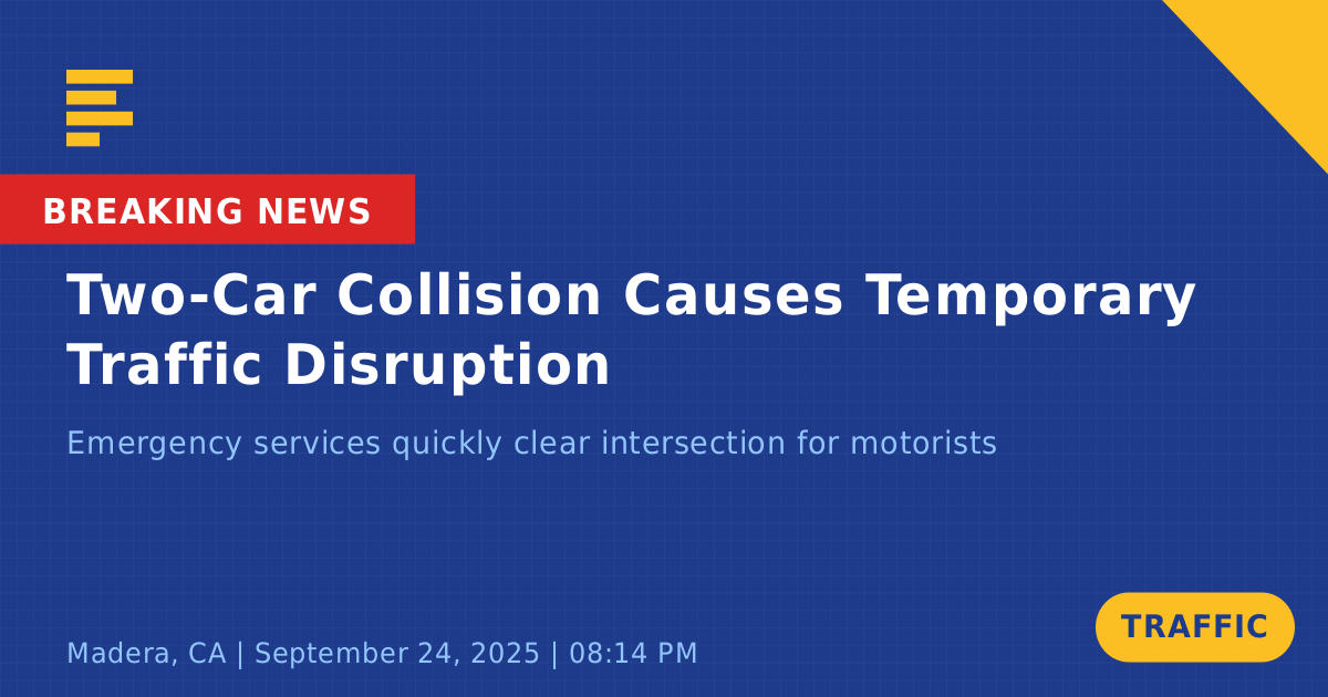 A traffic collision involving two vehicles occurred today at the intersection of Avenue 15 and Brookhill Road in Madera, CA. The incident, which took place around 8:14 PM, involved a gray Ford pickup and a gold Toyota. Emergency services were quickly dispatched to the scene to manage traffic and ensure safety.
