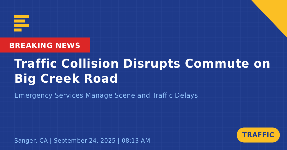 A traffic collision occurred today on Big Creek Road in Sanger, CA, leading to significant traffic management efforts. The incident was reported around 8:14 AM during the morning commute, prompting a swift response from emergency services, including the California Highway Patrol (CHP) and CAL FIRE.