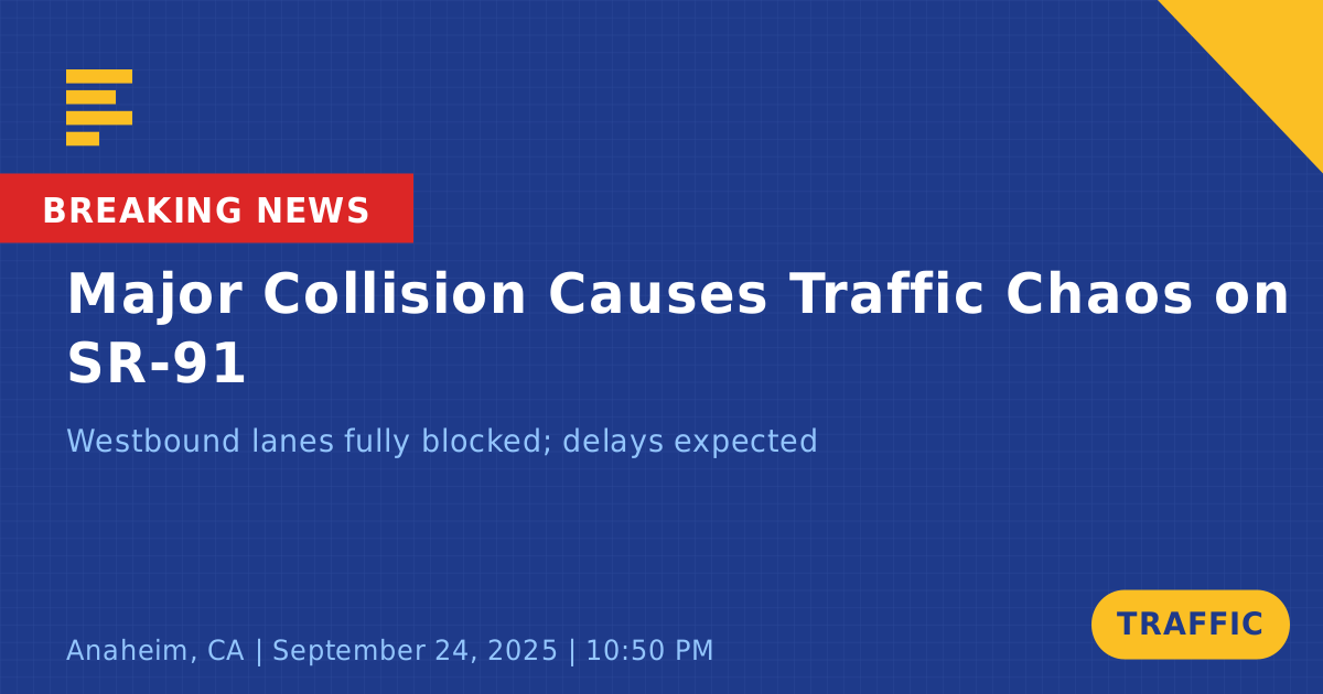 A significant traffic incident occurred today on the westbound lanes of State Route 91 (SR-91) at the intersection with State Route 55 (SR-55) in Anaheim, CA. The collision involved two vehicles, a gray Kia sedan and a white Kia sedan, leading to full lane closures and substantial road blockage in the area.