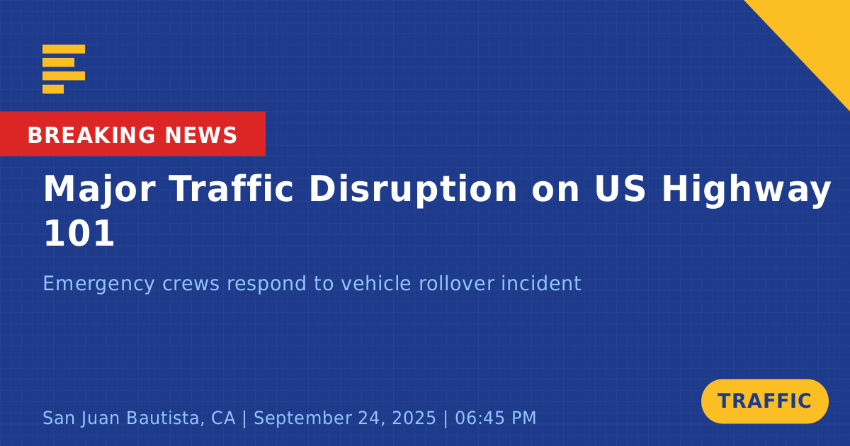 A traffic collision occurred today on US Highway 101 South, near the State Route 156 West connector in San Juan Bautista, CA. The incident took place around 6:46 PM and involved one vehicle that flipped multiple times, rendering it inoperable and requiring a tow truck for removal.