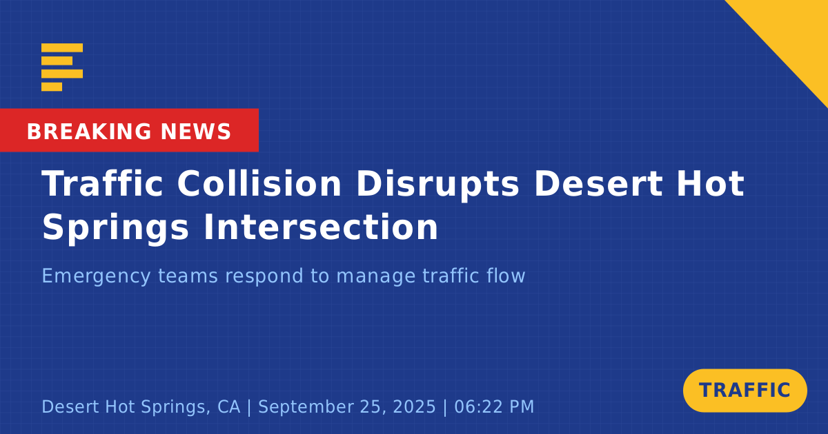 A traffic collision occurred today at the intersection of Long Canyon Road and Dillon Road in Desert Hot Springs, CA, impacting traffic flow significantly. The incident, which took place around 6:22 PM, involved one vehicle that left the roadway and made contact with the ground.