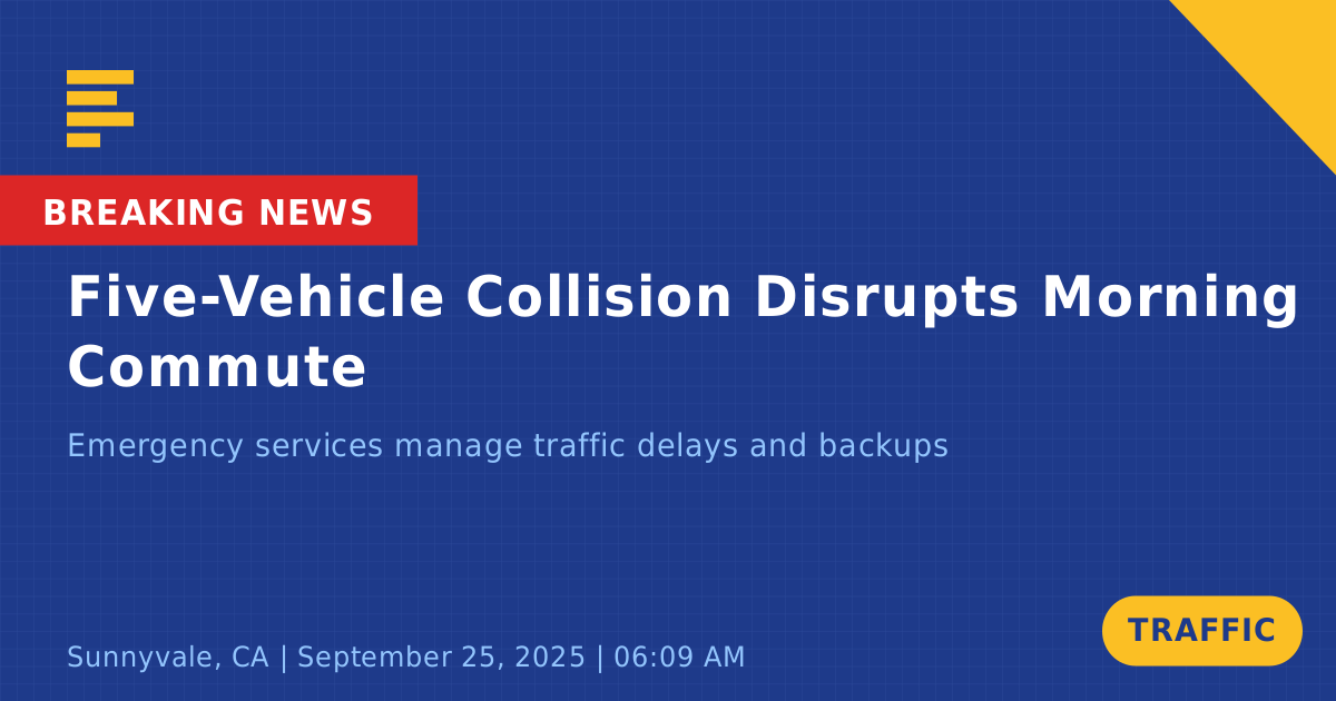 A traffic collision occurred today on State Route 237 West at Mathilda Avenue Off-Ramp in Sunnyvale, CA, involving five vehicles. The incident took place during the morning commute around 6:10 AM and included a grey Hyundai Elantra, a grey Tesla with rear-end damage, a blue Honda Civic, a Kia, and a Toyota.