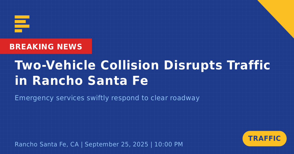 A traffic collision occurred today at 16920 Via De Santa Fe in Rancho Santa Fe, CA, involving two vehicles—a moving vehicle and a parked car. The incident was reported around 10:01 PM, leading to a swift response from emergency services to manage the situation and ensure safety on the roads.