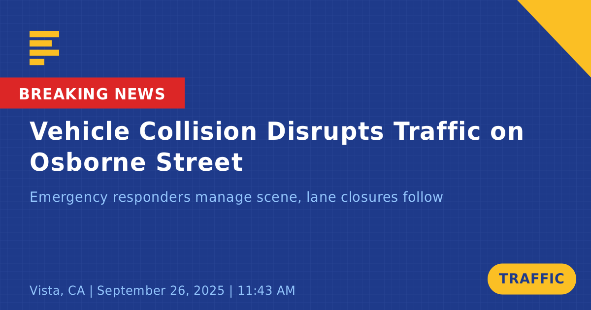 A traffic collision occurred today at 462 Osborne Street in Vista, CA, involving a single vehicle that struck a residence, a fence, and a tree. The incident was reported around 11:43 AM, causing significant disruption in the area. Emergency response units quickly arrived to manage the scene and control traffic flow.