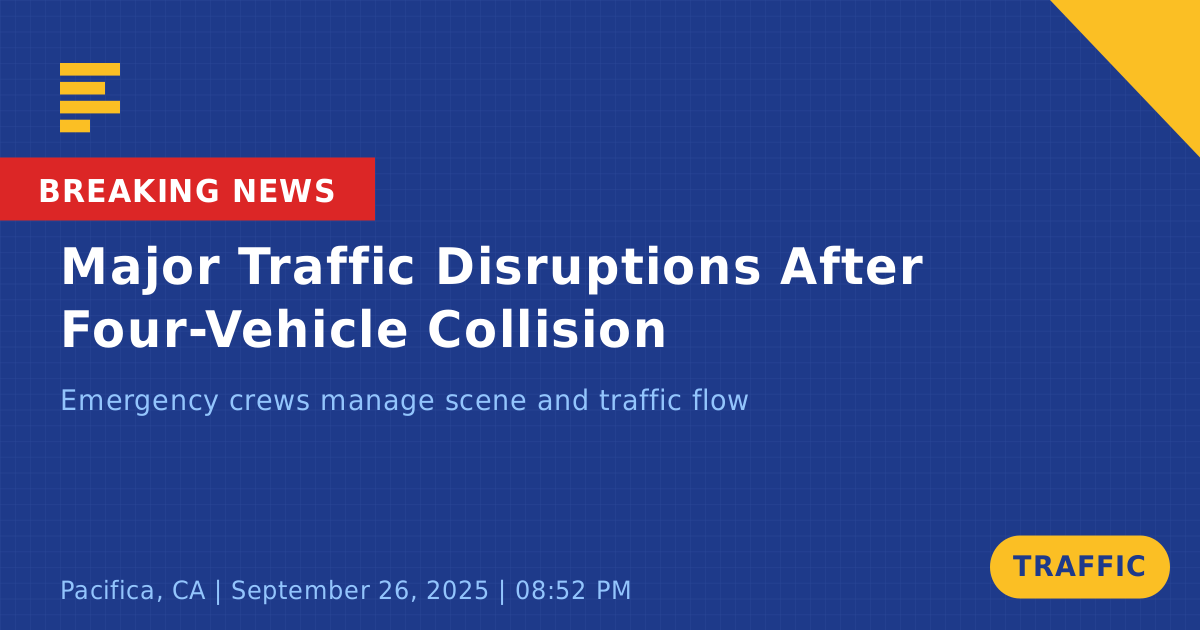 A traffic collision involving four vehicles occurred today on State Route 1 South near State Route 35 in Pacifica, CA. The incident was reported shortly after 8:53 PM and has led to significant traffic disruptions in the area. Among the vehicles involved are a gray Honda and a green Honda, with some vehicles remaining on the scene while tow services are addressing the situation.