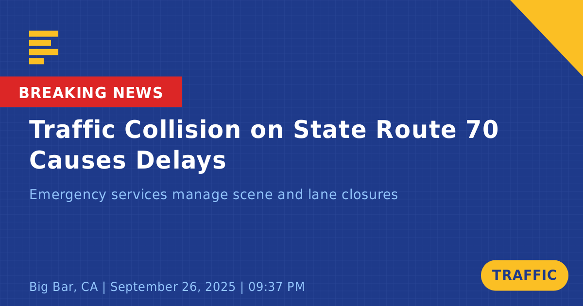 A traffic collision involving two vehicles occurred today on State Route 70 in Big Bar, CA, leading to significant traffic disruptions. The incident was reported around 9:38 PM, with one vehicle sustaining heavy damage. Emergency services quickly responded to the scene to manage traffic and ensure safety.