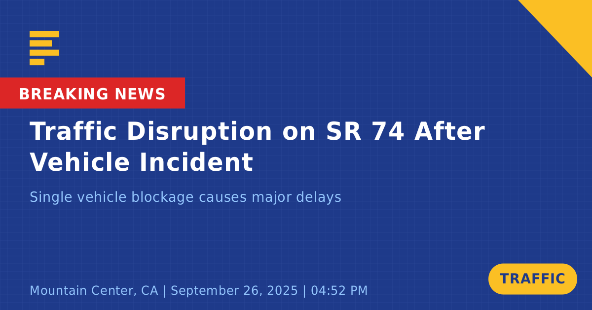 A traffic collision occurred today on State Route 74 West near Bighorn Overlook in Mountain Center, CA, causing significant disruptions to traffic flow. The incident took place around 4:54 PM and involved a single vehicle, identified as a white Toyota, which reportedly suffered a tire blowout. This vehicle became undriveable and ended up blocking the downhill lanes, leading to lane closures and traffic stoppages.