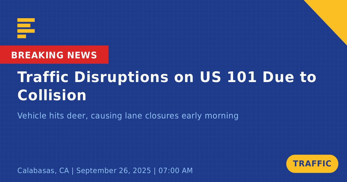 A traffic collision on US Highway 101 East in Calabasas, CA, caused notable disruptions during the morning commute today. The incident involved one vehicle, a white Toyota, which collided with a deer, resulting in lane closures and visual hazards on the roadway. As a consequence, drivers experienced swerving traffic and potential delays as they navigated the affected area.