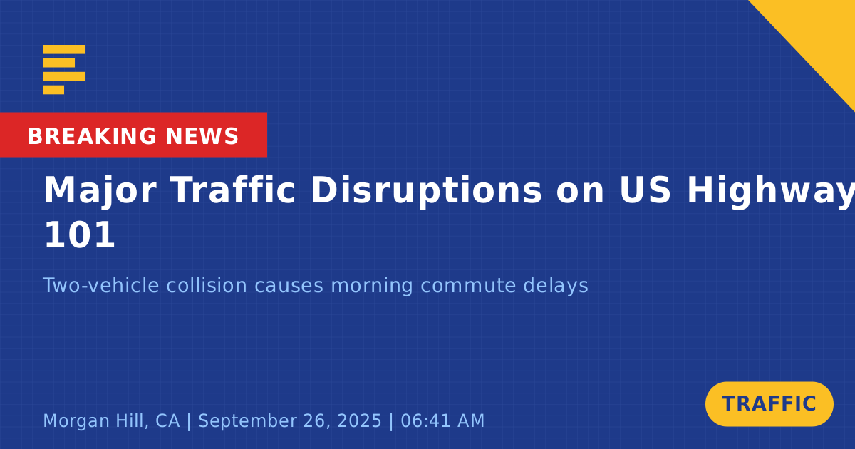 A traffic collision on US Highway 101 North in Morgan Hill, CA, caused significant traffic disruptions this morning. The incident occurred around 6:42 AM and involved two vehicles. Emergency response teams arrived promptly to manage the situation and control traffic flow.