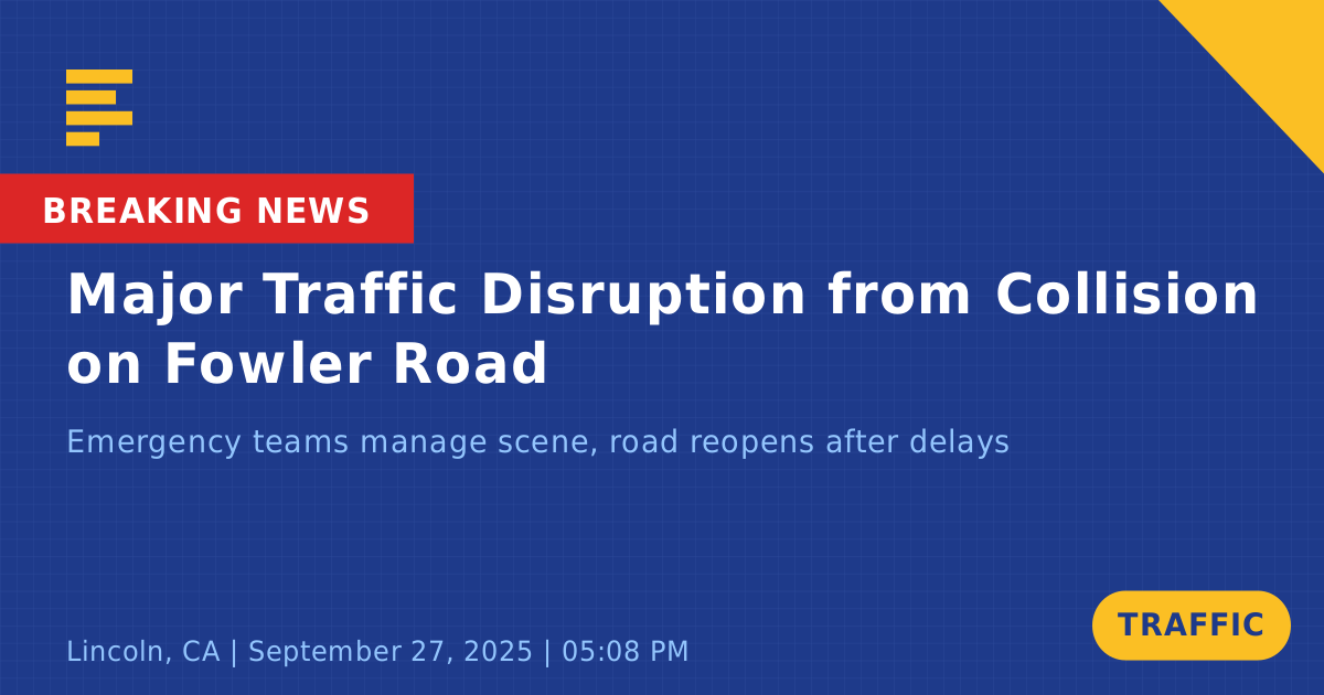 A traffic collision on Fowler Road in Lincoln, CA, today caused significant disruptions to local traffic. The incident, involving two vehicles—a white Mercedes GLE and an unidentified second vehicle—occurred around 5:10 PM. The collision resulted in the Mercedes striking a tree, prompting a temporary road closure to facilitate scene management and vehicle removal.