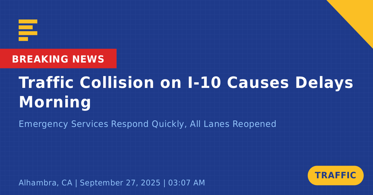 A traffic collision involving two vehicles occurred today on Interstate 10 West near the Fremont Avenue off-ramp in Alhambra, CA. The incident took place during the early morning hours and involved a white Subaru with front-end damage and an unknown white vehicle that may have left the scene.