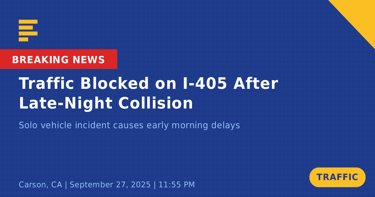 A traffic collision on Interstate 405 North in Carson, CA, caused significant lane blockages today. The incident occurred around midnight and involved one vehicle. Initial reports suggested the involvement of a motorcycle and a dark-colored SUV, but it was later confirmed that only a solo vehicle was involved in the traffic incident.
