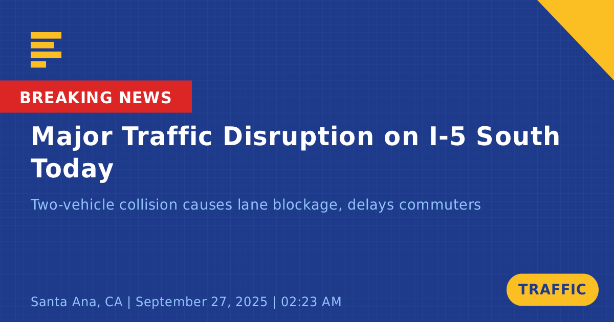 A traffic collision on Interstate 5 South (I-5 S) in Santa Ana, CA, caused significant disruptions to traffic flow today. The incident involved two vehicles and was reported around 2:23 AM. One vehicle, which blocked the right lane, was associated with a fire call, prompting a tow request for the other vehicle.