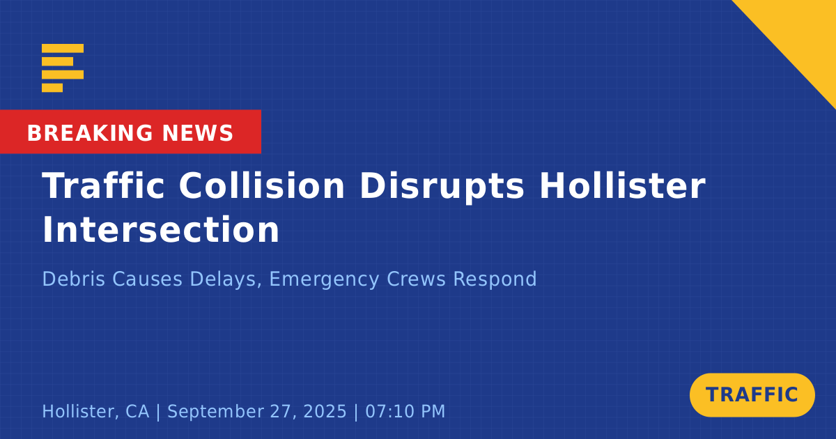 A traffic collision involving two vehicles occurred today at the intersection of State Route 156 and State Route 25 in Hollister, CA. The incident took place around 7:12 PM and involved a silver Honda SUV with modified front details and an unknown vehicle. Debris from the collision was left scattered on the roadway, prompting emergency units to respond and manage the scene.