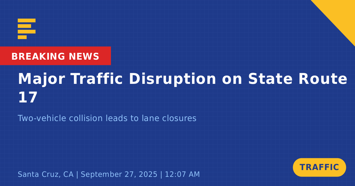 A traffic collision on State Route 17 South in Santa Cruz, CA, caused significant disruptions today. The incident, which occurred around midnight, involved two vehicles: one vehicle was found on its side and was deemed not drivable, while the second vehicle, a 1997 model, stopped at the scene.
