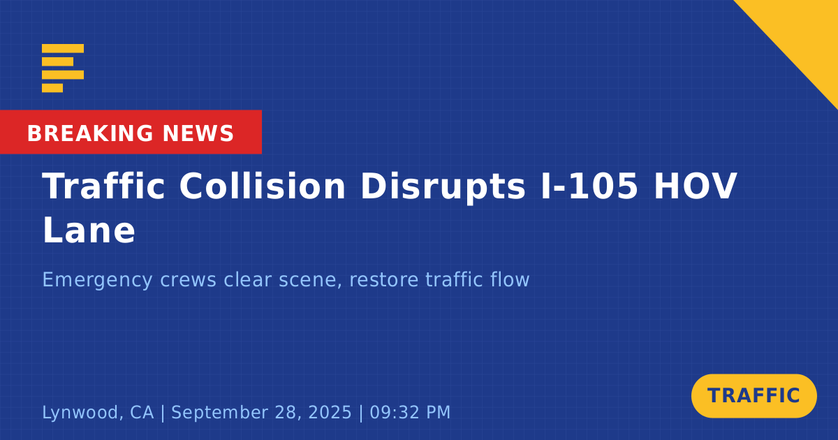 A traffic collision involving two vehicles occurred today on the Interstate 105 East near the Long Beach Boulevard off-ramp in Lynwood, CA. The incident took place around 9:44 PM and involved a Toyota RAV4 and another vehicle identified as “CD.” The collision resulted in the blockage of the High-Occupancy Vehicle (HOV) lane, while all other lanes remained open, allowing for continued traffic flow.