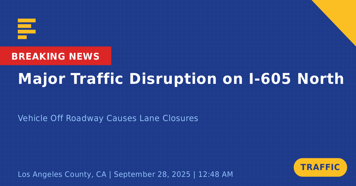 A traffic collision on Interstate 605 North in Los Angeles County, CA, has resulted in significant traffic disruptions today. The incident occurred around 12:50 AM when one vehicle went off the roadway and became non-drivable. This situation led to a complete stoppage of all lanes in the affected area, causing considerable delays for drivers.