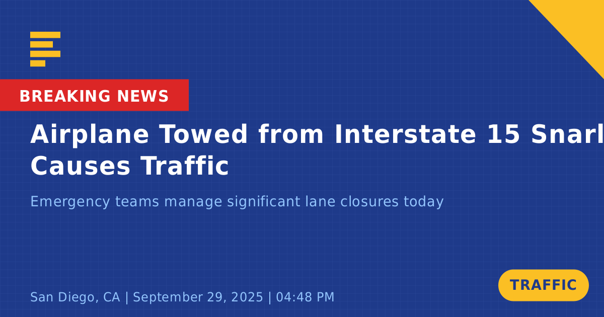 A traffic incident on Interstate 15 North in San Diego, CA, has caused significant disruptions today. The incident, which occurred around 4:48 PM, involved two vehicles, including an airplane identified as B87-021B that is currently being towed from the scene.
