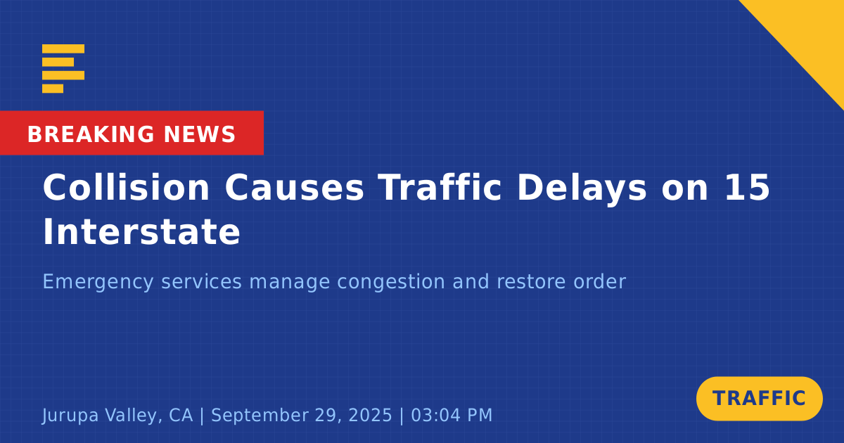 A traffic collision involving two vehicles occurred today on the Interstate 15 South at the Limonite Avenue on-ramp in Jurupa Valley, CA. The incident took place around 3:05 PM, involving a grey Chevrolet Camaro and a white Lexus SUV, both situated on the right-hand side of the road.