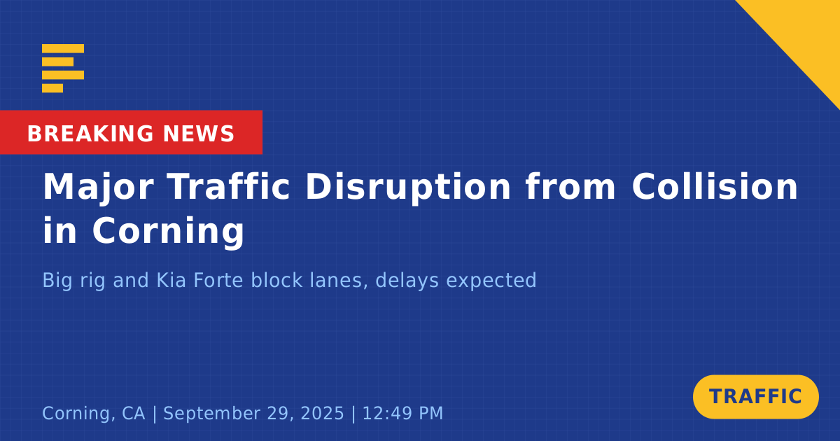A traffic collision involving two vehicles, a big rig and a Kia Forte, occurred today at the intersection of Interstate 5 North and South Avenue On-Ramp in Corning, CA. The incident was reported at approximately 12:49 PM, causing significant disruptions to traffic flow in the area.
