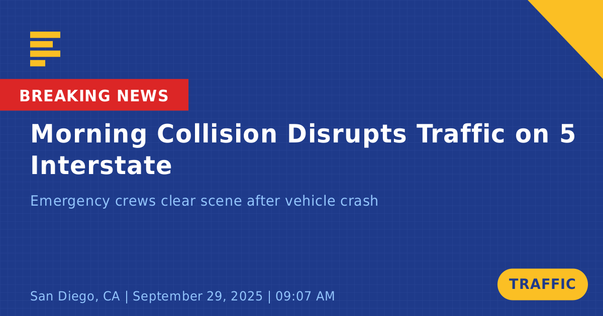 A traffic collision on Interstate 5 North in San Diego, CA, disrupted traffic flow during the morning commute today. The incident, involving one vehicle, a blue/light blue Lexus SUV, occurred around 9:09 AM near the Clairemont area, close to the Mission Bay exit. The vehicle collided with the center divider, causing lane one to be partially blocked.