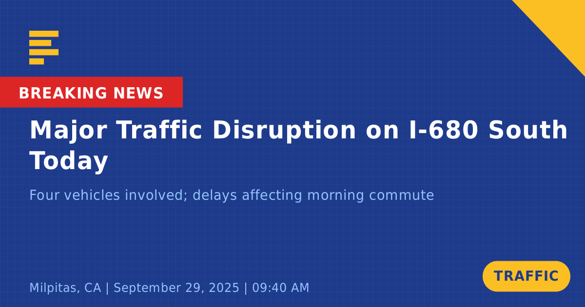 A traffic collision occurred today on Interstate 680 South at the Montague Expressway Off-Ramp in Milpitas, CA, involving four vehicles: a semi truck, a box truck, a white Ford pickup, and a Ford F150. The incident was reported around 9:38 AM, causing significant traffic disruptions during the morning commute.