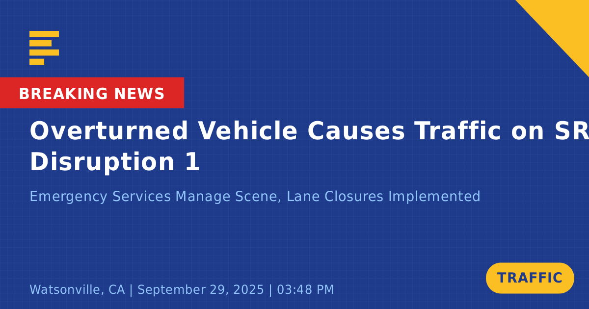 A traffic collision occurred today on State Route 1 South near the Harkins Slough Road On-Ramp in Watsonville, CA, leading to notable traffic disruptions. The incident was reported at approximately 3:48 PM, involving one vehicle that overturned and came to rest on its roof.