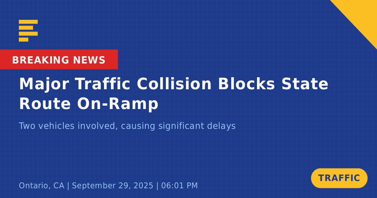 A traffic collision occurred today at approximately 5:58 PM near the on-ramp of State Route 60 East and Vineyard Avenue in Ontario, CA. The incident involved two vehicles: a gray Ford F150 and a white Nissan. The collision resulted in the blockage of the on-ramp, leading to significant traffic delays and congestion in the area.