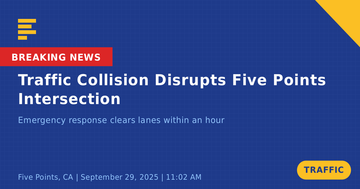 A traffic collision occurred today at the intersection of W Jeffrey Avenue and Lassen Avenue in Five Points, CA, involving two vehicles: a blue semi-truck with a blue trailer and a blue Ford F150 pickup truck. The incident was reported at approximately 11:02 AM, causing temporary disruptions in the northbound lanes.