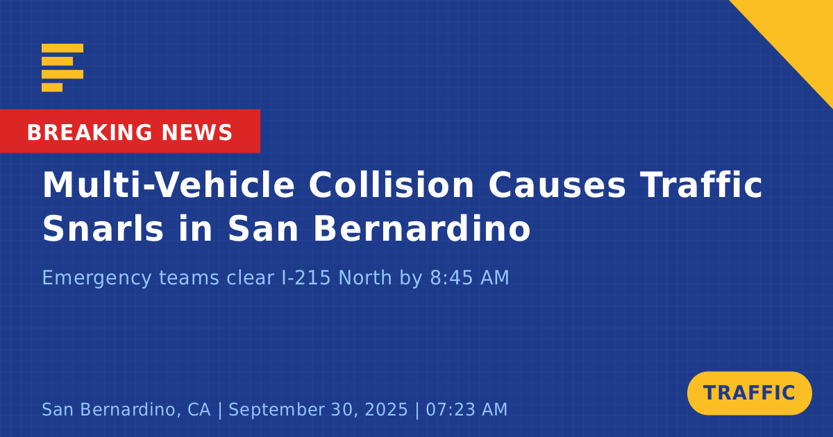 A traffic collision involving five vehicles occurred this morning on Interstate 215 North near Mill Street in San Bernardino, CA. The incident was reported at approximately 7:24 AM and initially caused significant lane blockages in both the slow and exit lanes, impacting the flow of traffic during the busy morning commute.