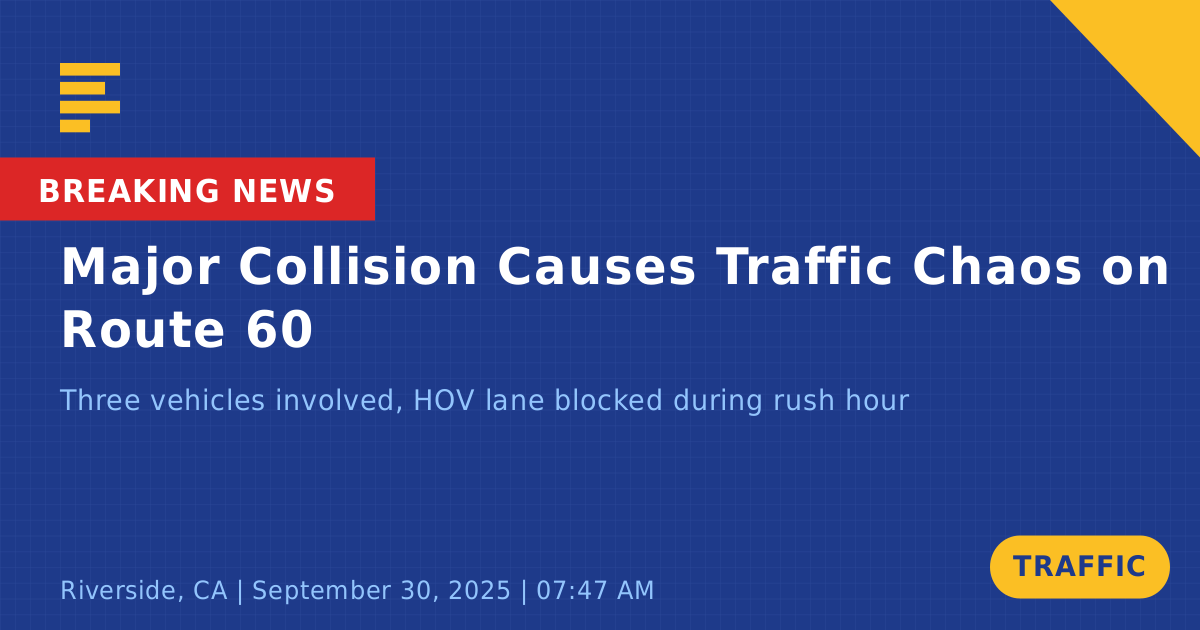 A traffic collision involving three vehicles occurred today on State Route 60 East at the intersection with Rubidoux Boulevard in Riverside, CA. The incident was reported around 7:48 AM during the busy morning commute. The vehicles involved included a gray Toyota, a gray Honda, and a blue Honda.