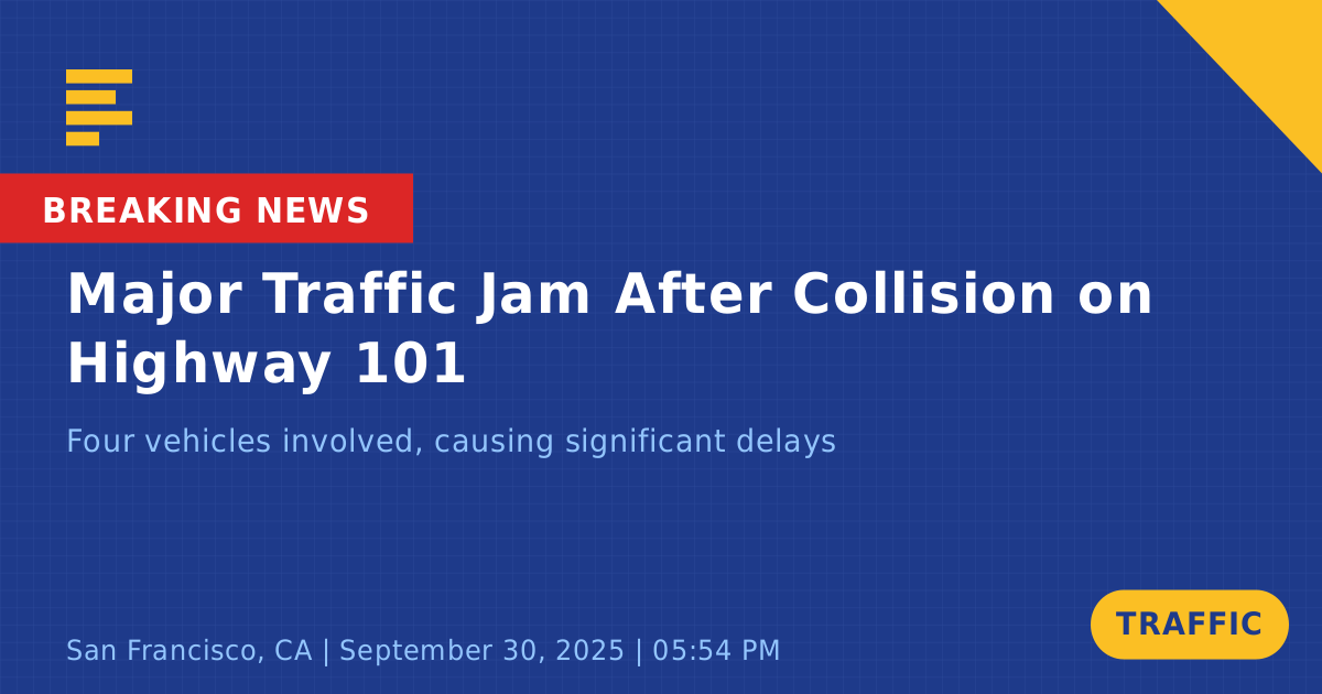 A traffic collision occurred today on US Highway 101 South near the Cesar Chavez Street off-ramp in San Francisco, CA, leading to significant traffic congestion during the evening commute. The incident involved four vehicles: a blue Suburban, a black Mercedes sedan, a black Jeep Renegade, and a silver Toyota SUV.