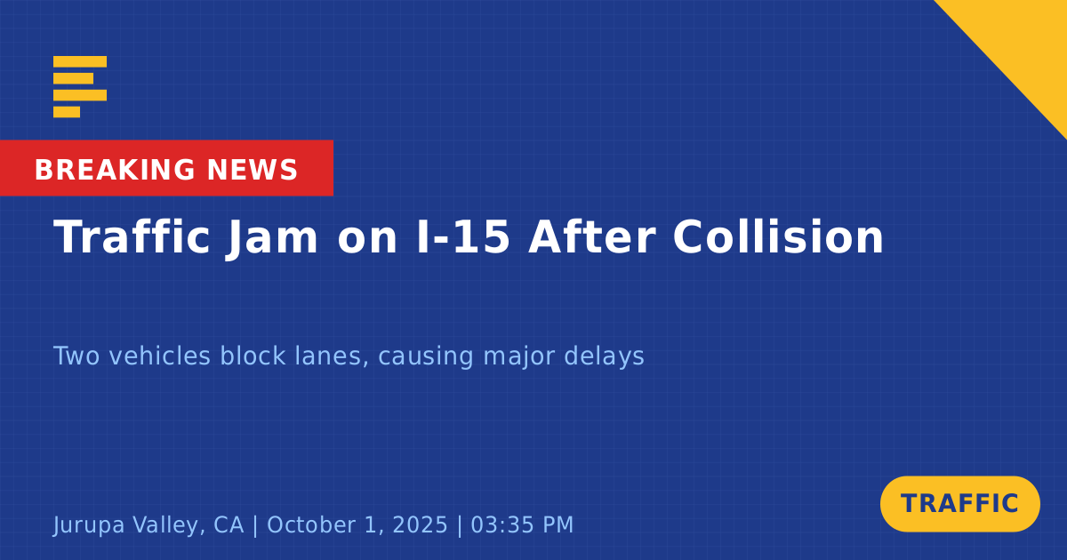 A traffic collision on Interstate 15 North in Jurupa Valley, CA, caused significant traffic disruptions today. The incident occurred around 3:37 PM and involved two vehicles: a blue BMW 428I and a gray Jeep. Both vehicles were confirmed to be driveable but were blocking multiple lanes, leading to slow lane conditions and backups for motorists.