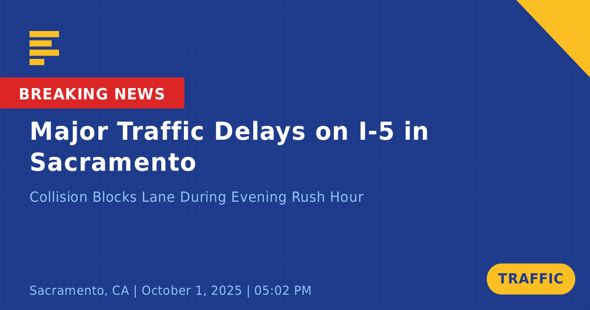 A traffic collision on Interstate 5 South (I-5) in Sacramento, CA, caused significant traffic delays today during the evening rush hour. The incident occurred around 5:04 PM and involved two vehicles: a grey Honda Atlas and an unknown vehicle. The collision took place in the collision domain, resulting in the blockage of one lane and contributing to traffic congestion in the area.